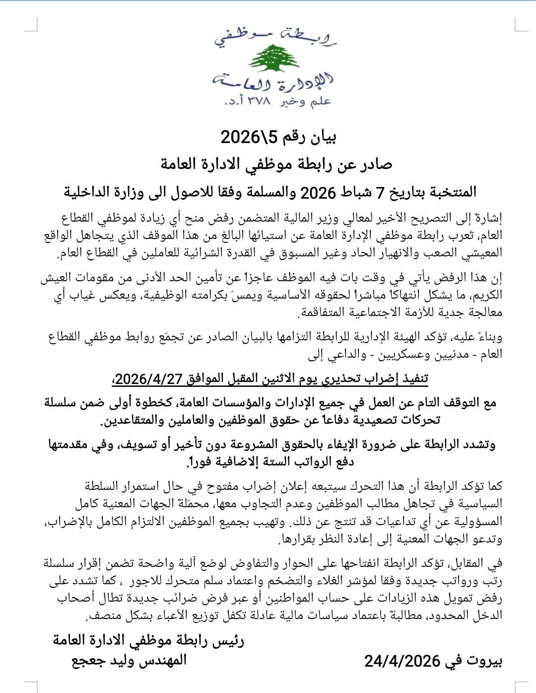 بيان رقم 5/2026 صادر عن رابطة موظفي الإدارة العامة المنتخبة بتاريخ 7 شباط 2026 والمسلمة وفقًا للأصول إلى وزارة الداخلية. إشارةً إلى التصريح الأخير لمعالي وزير المالية المتضمن رفض منح أي زيادة لموظفي القطاع العام، تعرب رابطة موظفي الإدارة العامة عن استيائها البالغ من هذا الموقف الذي يتجاهل الواقع المعيشي الصعب والانهيار الحاد وغير المسبوق في القدرة الشرائية للعاملين في القطاع العام. إن هذا الرفض يأتي في وقت بات فيه الموظف عاجزًا عن تأمين الحد الأدنى من مقومات العيش الكريم، ما يشكل انتهاكًا مباشرًا لحقوقه الأساسية ويمسّ بكرامته الوظيفية، ويعكس غياب أي معالجة جدية للأزمة الاجتماعية المتفاقمة. وبناءً عليه، تؤكد الهيئة الإدارية للرابطة التزامها بالبيان الصادر عن تجمع روابط موظفي القطاع العام (مدنيين وعسكريين)، والداعي إلى تنفيذ إضراب تحذيري يوم الاثنين المقبل الموافق 27/4/2026، مع التوقف التام عن العمل في جميع الإدارات والمؤسسات العامة، كخطوة أولى ضمن سلسلة تحركات تصعيدية دفاعًا عن حقوق الموظفين والعاملين والمتقاعدين. وتشدد الرابطة على ضرورة الإيفاء بالحقوق المشروعة دون تأخير أو تسويف، وفي مقدمتها دفع الرواتب الستة الإضافية فورًا. كما تؤكد أن هذا التحرك سيتبعه إعلان إضراب مفتوح في حال استمرار السلطة السياسية في تجاهل مطالب الموظفين وعدم التجاوب معها، محملة الجهات المعنية كامل المسؤولية عن أي تداعيات قد تنجم عن ذلك، وتهيب بجميع الموظفين الالتزام الكامل بالإضراب، وتدعو الجهات المعنية إلى إعادة النظر بقراراتها. في المقابل، تؤكد الرابطة انفتاحها على الحوار والتفاوض لوضع آلية واضحة تتضمن إقرار سلسلة رتب ورواتب جديدة وفقًا لمؤشر الغلاء والتضخم، واعتماد سلم متحرك للأجور. كما تشدد على رفض تمويل هذه الزيادات على حساب المواطنين أو عبر فرض ضرائب جديدة تطال أصحاب الدخل المحدود، مطالبةً باعتماد سياسات مالية عادلة تكفل توزيع الأعباء بشكل منصف. بيروت في 24/4/2026 رئيس رابطة موظفي الإدارة العامة المهندس وليد جعجع