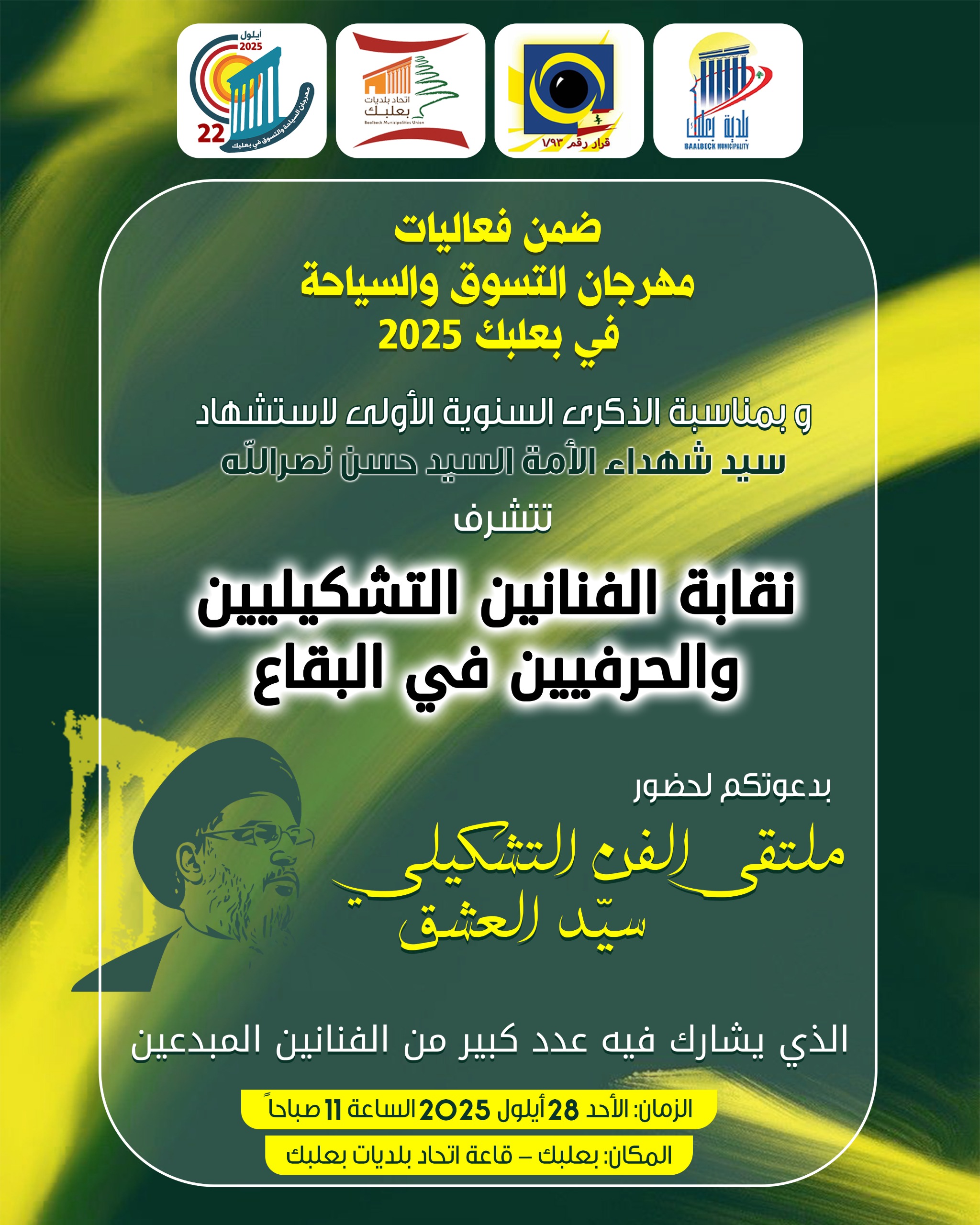 في أجواء مهرجان التسوق والسياحة في بعلبك 2025، وبمناسبة الذكرى السنوية الأولى لاستشهاد سيد شهداء الأمة السيد حسن نصرالله، تنظّم نقابة الفنانين التشكيليين والحرفيين في البقاع ملتقى فنياً بعنوان "ملتقى الفن التشكيلي – سيد العشق"، بمشاركة عدد كبير من الفنانين المبدعين. الملتقى سيقام صباح الأحد في 28 أيلول 2025 في قاعة اتحاد بلديات بعلبك، وسيشكّل مساحة فنية وثقافية جامعة، يعبّر من خلالها الفنانون التشكيليون عن قيم العطاء والفداء من خلال لوحات وأعمال فنية تحمل بصمات وجدانية عميقة. ويأتي هذا النشاط ليؤكد دور الفن التشكيلي في تخليد القيم الإنسانية والوطنية، وجعل الإبداع جسراً للتواصل بين الأجيال وحاملاً لذاكرة الشعوب. |