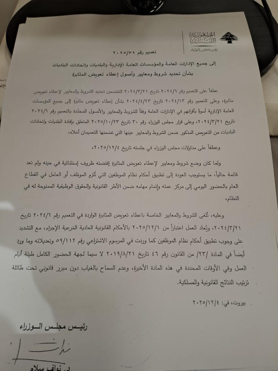 أصدر رئيس الحكومة التعميم رقم 39/2025 وجاء فيه: إلى جميع الإدارات العامة والمؤسسات العامة الإدارية والبلديات واتحادات البلديات بشأن تحديد شروط ومعايير وأصول إعطاء تعويض المثابرة عطفاً على التعميم رقم 6/2024 تاريخ 21/03/2024 المتضمن تحديد الشروط والمعايير لإعطاء تعويض مثابرة، وعلى التعميم رقم 13/2024 تاريخ 23/04/2024 بشأن إعطاء تعويض مثابرة إلى جميع المؤسسات العامة الإدارية أسوة بأقرانهم في الإدارات العامة، وفقاً للشروط والمعايير والأصول المحدّدة في التعميم رقم 6/2024 تاريخ 21/03/2024، وعلى قرار مجلس الوزراء رقم 30 تاريخ 23/10/2025 المتعلّق بإفادة البلديات واتحادات البلديات من التعويض المذكور ضمن الشروط والمعايير عينها التي تضمنها التعميمان أعلاه، وعطفاً على مداولات مجلس الوزراء في جلسته بتاريخ 04/12/2025، ولما كان وضع شروط ومعايير لإعطاء تعويض المثابرة قد اقتضته ظروف استثنائية في حينه ولم تعد قائمة حالياً، ما يستوجب العودة إلى تطبيق أحكام نظام الموظفين التي تُلزم الموظف أو العامل في القطاع العام بالحضور اليومي إلى مركز عمله وإتمام مهامه ضمن الأطر القانونية والحقوق الوظيفية الممنوحة له في النظام، وعليه، تُلغى الشروط والمعايير الخاصة بإعطاء تعويض المثابرة الواردة في التعميم رقم 6/2024 تاريخ 21/03/2024، ويُعاد العمل اعتباراً من 01/12/2025 بالأحكام القانونية العادية المرعية الإجراء، مع التشديد على وجوب تطبيق أحكام نظام الموظفين كما وردت في المرسوم الاشتراعي رقم 59/112 وتعديلاته، وما ورد أيضاً في المادة 23 من القانون رقم 46 تاريخ 21/08/2017، ولا سيما لجهة الحضور الكامل طيلة أيام العمل وفي الأوقات المحددة في هذه المادة الأخيرة، وعدم السماح بالغياب دون مبرّر قانوني تحت طائلة ترتيب النتائج القانونية والمسلكية. بيروت، في: 04/12/2025