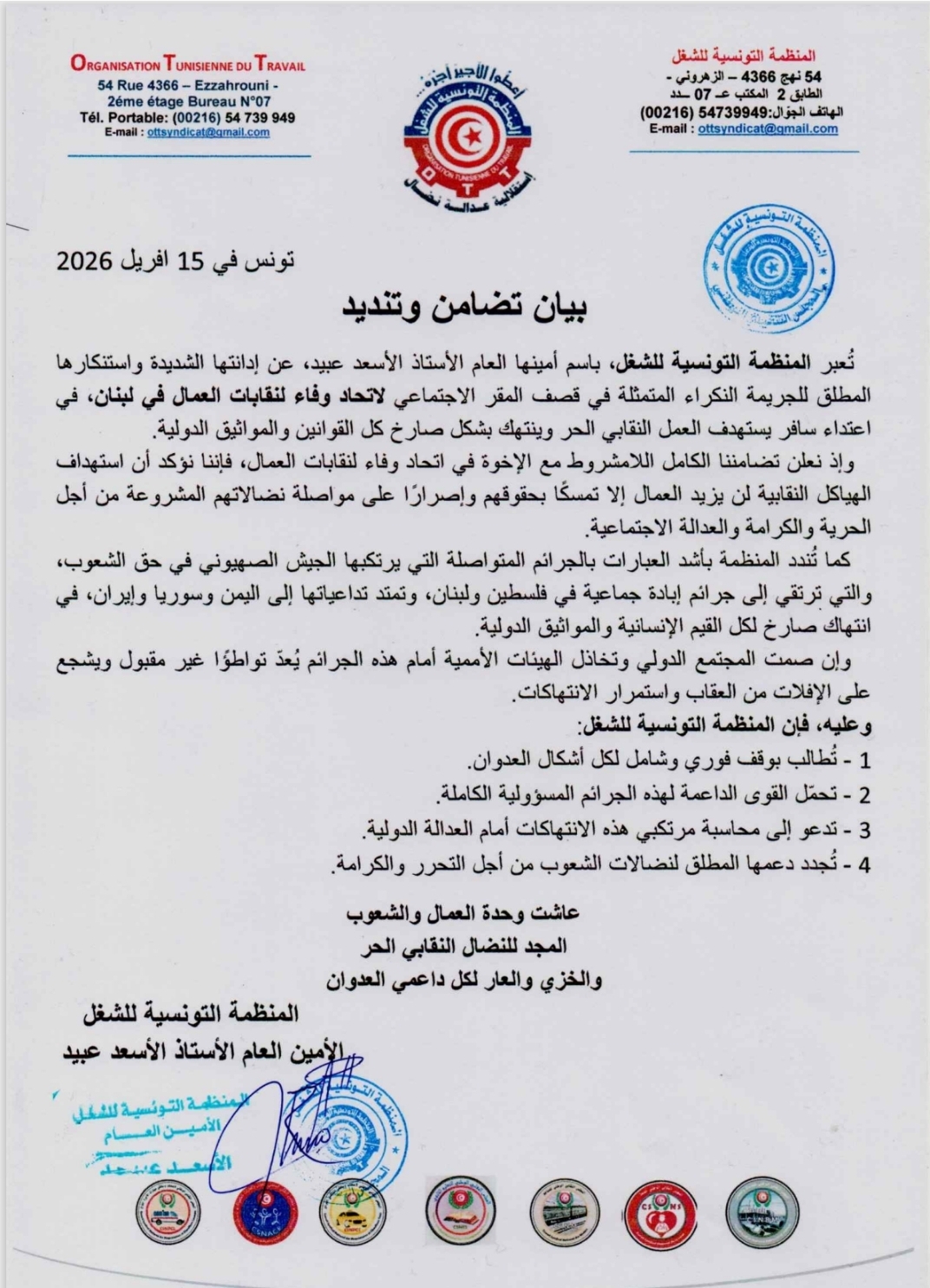 تُعبر المنظمة التونسية للشغل، باسم أمينها العام الأستاذ الأسعد عبيد، وباسم كل هياكلها وقواعدها النقابية، عن إدانتها الشديدة واستنكارها المطلق للجريمة النكراء المتمثلة في قصف المقر الاجتماعي لاتحاد وفاء لنقابات العمال في لبنان، في اعتداء سافر يستهدف العمل النقابي الحر وينتهك بشكل صارخ كل القوانين والمواثيق الدولية. وإذ نُعلن تضامننا الكامل واللامشروط مع الإخوة في اتحاد وفاء لنقابات العمال في لبنان، فإننا نؤكد أن استهداف الهياكل النقابية لن يزيد العمال إلا تمسكًا بحقوقهم وإصرارًا على مواصلة نضالاتهم المشروعة من أجل الحرية والكرامة والعدالة الاجتماعية. كما تُندد المنظمة بأشد العبارات بالجرائم المتواصلة التي يرتكبها الجيش الصهيوني في حق الشعوب، والتي ترتقي إلى جرائم إبادة جماعية في فلسطين ولبنان، وتمتد تداعياتها إلى اليمن وسوريا وإيران، في انتهاك صارخ لكل القيم الإنسانية والمواثيق الدولية. وإن صمت المجتمع الدولي وتخاذل الهيئات الأممية أمام هذه الجرائم يُعدّ تواطؤًا غير مقبول ويشجع على الإفلات من العقاب واستمرار الانتهاكات. وعليه، فإن المنظمة التونسية للشغل: 1 - تُطالب بوقف فوري وشامل لكل أشكال العدوان. 2 - تُحمّل القوى الداعمة لهذه الجرائم المسؤولية الكاملة. 3 - تدعو إلى محاسبة مرتكبي هذه الانتهاكات أمام العدالة الدولية. 4- تُجدد دعمها المطلق لنضالات الشعوب من أجل التحرر والكرامة. عاشت وحدة العمال والشعوب المجد للنضال النقابي الحر والخزي والعار لكل داعمي العدوان