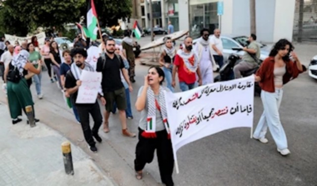 تظاهر أمس عشرات الشبان من شارع الحمرا في بيروت، إلى مبنى السفارة السعودية، رفضاً لقرار الحكومة اللبنانية حصر السلاح بيد الدولة، الذي صدر تحت الضغط الأميركي - السعودي. ورفع المشاركون شعارات داعمة لمقاومة الاحتلال.