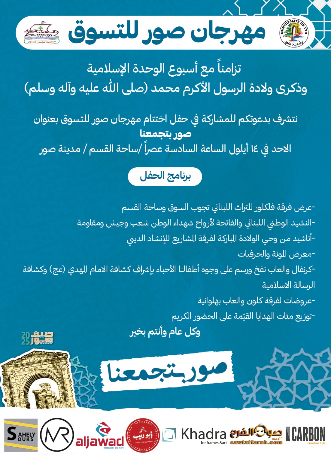 تزامنا مع أسبوع الوحدة الإسلامية وذكرى ولادة الرسول الأكرم محمد ( صلى الله عليه وآله وسلم ) دعت اللجنة المتظمة لمهرجان "صور بتجمعنا" للمشاركة في حفل اختتامه الاحد في ١٤ أيلول الساعة السادسة عصراً / ساحة القسم / مدينة صور. ووزعت اللجنة برنامج الحفل ليبدأ بعرض فرقة فلكلور للتراث اللبناني تجوب السوق وساحة القسم ومن ثم النشيد الوطني اللبناني والفاتحة لأرواح شهداء الوطن شعب وجيش ومقاومة، تليه أناشيد من وحي الولادة المباركة لفرقة المشاريع للإنشاد الديني ، وجولة في معرض المونة والحرفيات ، واقامة كرنفال والعاب نفخ ورسم على وجوه أطفالنا الأحباء بإشراف كشافة الامام المهدي ( عج ) وكشافة الرسالة الاسلامية ، ومن ثم عروضات لفرقة كلون والعاب بهلوانية ويختتم بتوزيع مئات الهدايا القيمة على الحضور الكريم. |