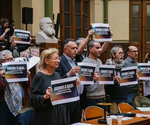 نظمت نقابات الصحفيين الفرنسيين، بما في ذلك النقابة الوطنية للصحفيين الفرنسيين (SNJ)، ونقابة الصحفيين التابعة للكونفدرالية النقابية العامة في فرنسا (CGT)، ونقابة الصحفيين في الكونفدرالية الديمقراطية الفرنسية للعمل (CFDT)، مهرجانًا تضامنيًا مع الصحفيين الفلسطينيين، لا سيما في قطاع غزة. وأقيم المهرجان في قاعة الكونفدرالية العامة للنقابات الفرنسية بالعاصمة باريس، بحضور رئيسة الاتحاد الدولي للصحفيين دومينيك برادلي، ونقيب الصحفيين الفلسطينيين ناصر أبو بكر، وعدد من القيادات النقابية الفرنسية. وأكد المنظمون تضامنهم مع الصحفيين الفلسطينيين في غزة، مشيدين بشجاعتهم ومهنيتهم في نقل الحقيقة رغم المخاطر التي يواجهونها، وطالبوا بالسماح الفوري للصحفيين الأجانب بالدخول إلى القطاع. من جانبه، شكر ناصر أبو بكر النقابات الفرنسية على مبادرتها التضامنية، مؤكدًا أن هذا الدعم يشكل رسالة مهمة للصحفيين في غزة الذين يواصلون أداء واجبهم المهني في ظل ظروف صعبة. ودعا إلى فتح القطاع أمام الصحافة الدولية لضمان نقل الحقائق، مشددًا على أن حماية الصحفيين واحترام حرية العمل الصحفي مسؤولية إنسانية وأخلاقية تقع على المجتمع الدولي. المصدر: شبكة يافا الإخبارية |