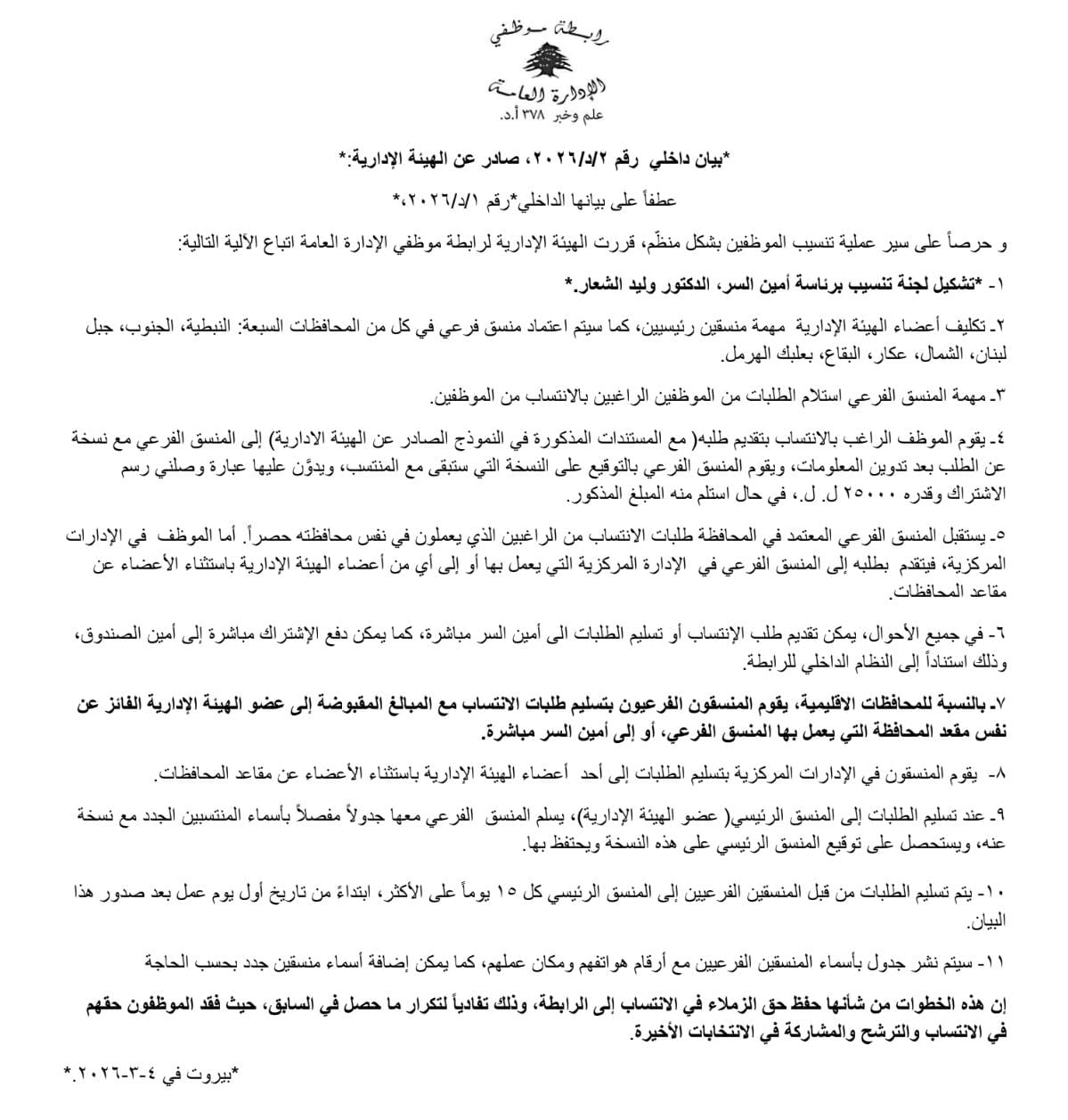 بيان داخلي رقم 2/2026، صادر عن الهيئة الإدارية: عطفاً على بيانها الداخلي رقم 1/2026، وحرصاً على سير عملية تنسيب الموظفين بشكل منظم، قررت الهيئة الإدارية لرابطة موظفي الإدارة العامة اتباع الآلية التالية: 1- تشكيل لجنة تنسيب برئاسة أمين السر، الدكتور وليد الشعار. 2- تكليف أعضاء الهيئة الإدارية مهمة منسقين رئيسيين، كما سيتم اعتماد منسق فرعي في كل من المحافظات السبع: النبطية، الجنوب، جبل لبنان، الشمال، عكار، البقاع، بعلبك الهرمل. 3- مهمة المنسق الفرعي استلام الطلبات من الموظفين الراغبين بالانتساب. 4- يقوم الموظف الراغب بالانتساب بتقديم طلب (مع المستندات المذكورة في النموذج الصادر عن الهيئة الإدارية) إلى المنسق الفرعي مع نسخة عن الطلب بعد تدوين المعلومات، ويقوم المنسق الفرعي بالتوقيع على النسخة التي تعود للمنتسب، ويكتب عليها عبارة "وصلني رسم الاشتراك وقدره 20000 ل.ل." في حال تسلمه المبلغ المذكور منه. 5- يستقبل المنسق الفرعي المعتمد في المحافظة طلبات الانتساب من الراغبين الذين يعملون في نفس محافظته حصراً. أما الموظف في الإدارات المركزية، فيتقدم بطلبه إلى المنسق الفرعي في الإدارة المركزية التي يعمل بها أو إلى أي من أعضاء الهيئة الإدارية باستثناء الأعضاء عن مقاعد المحافظات. 6- في جميع الأحوال، يمكن تقديم طلب الانتساب أو تسليم الطلبات إلى أمين السر مباشرة، كما يمكن دفع الاشتراك مباشرة إلى أمين الصندوق، وذلك استناداً إلى النظام الداخلي للرابطة. 7- بالنسبة للمحافظات الإقليمية، يقوم المنسقون الفرعيون بتسليم طلبات الانتساب مع المبالغ المقبوضة إلى عضو الهيئة الإدارية الفائز عن نفس مقعد المحافظة التي يعمل بها المنسق الفرعي، أو إلى أمين السر مباشرة. 8- يقوم المنسقون في الإدارات المركزية بتسليم الطلبات إلى أحد أعضاء الهيئة الإدارية باستثناء الأعضاء عن مقاعد المحافظات. 9- عند تسليم الطلبات إلى المنسق الرئيسي (عضو الهيئة الإدارية)، يسلم المنسق الفرعي معها جدولاً مفصلاً بأسماء المنتسبين الجدد مع نسخة عنه، ويتسلم توقيع المنسق الرئيسي على هذه النسخة ويحتفظ بها. 10- يتم تسليم الطلبات من قبل المنسقين الفرعيين إلى المنسق الرئيسي كل 15 يوماً على الأكثر، ابتداءً من تاريخ أول يوم عمل بعد صدور هذا البيان. 11- سيتم نشر جدول بأسماء المنسقين الفرعيين مع أرقام هواتفهم ومكان عملهم، كما يمكن إضافة أسماء منسقين جدد بحسب الحاجة. إن هذه الخطوات من شأنها حفظ حق الزملاء في الانتساب إلى الرابطة، وذلك تفادياً لتكرار ما حصل في السابق، حيث فقد الموظفون حقهم في الانتساب والترشح والمشاركة في الانتخابات الأخيرة. |