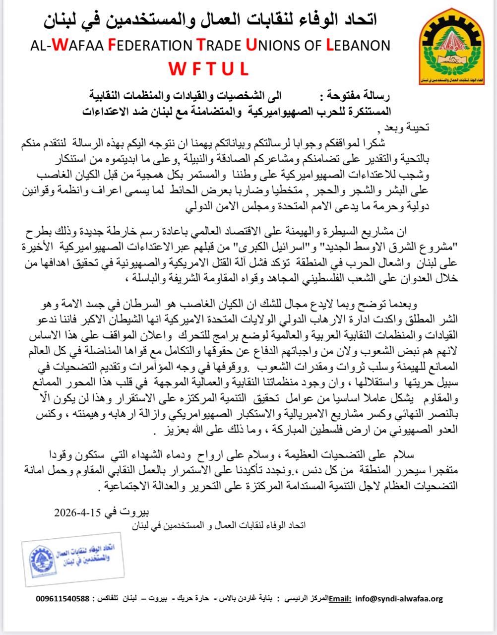 وجّه اتحاد الوفاء لنقابات العمال والمستخدمين في لبنان رسالة مفتوحة إلى الشخصيات والقيادات والمنظمات النقابية العربية والدولية ، وجاءت على الشكل التالي: إلى الشخصيات والقيادات والمنظمات النقابية المستنكرة للحرب الصهيونية الأميركية والمتضامنة مع لبنان في مواجهة الاعتداءات، تحية وبعد، نتوجه إليكم بجزيل الشكر والتقدير على مواقفكم ورسائلكم وبياناتكم، التي تعبّر عن تضامنكم الصادق ومشاعركم النبيلة، وما أبدَيتموه من استنكار وشجب للاعتداءات الصهيونية الأميركية المتواصلة على وطننا، والتي تستهدف الإنسان والحجر والشجر، في انتهاكٍ صارخ لكل الأعراف والمواثيق والقوانين الدولية، ولقرارات الأمم المتحدة ومجلس الأمن الدولي. إن مشاريع الهيمنة والسيطرة على الاقتصاد العالمي، ومحاولات إعادة رسم خارطة جديدة للمنطقة تحت عناوين ما يُسمّى بـ"الشرق الأوسط الجديد" و"إسرائيل الكبرى"، تتجلى بوضوح من خلال هذه الاعتداءات المتكررة على لبنان والمنطقة. إلا أن هذه المشاريع تؤكد، مرةً بعد مرة، فشل آلة القتل الأميركية–الصهيونية في تحقيق أهدافها، بفضل صمود الشعوب وقوى المقاومة، وفي طليعتها الشعب الفلسطيني المقاوم. وبناءً عليه، ندعو القيادات والمنظمات النقابية العربية والعالمية إلى مواصلة تحركها وتكثيف جهودها لوضع برامج نضالية مشتركة، تأكيدًا لحق الشعوب في الدفاع عن سيادتها وكرامتها، ومواجهة مشاريع الهيمنة وسلب الثروات. إن التكامل بين القوى النقابية المناضلة في العالم يشكّل ركيزة أساسية في التصدي للمؤامرات، وتعزيز مسيرة الحرية والاستقلال. كما نؤكد أن وجود منظمتنا النقابية، إلى جانب القوى الوطنية، يشكّل عاملًا أساسيًا في دعم صمود شعبنا وتعزيز التنمية المستدامة القائمة على العدالة الاجتماعية، وصولًا إلى تحقيق الاستقرار الحقيقي القائم على التحرر من الهيمنة والاحتلال. تحيةً لتضحياتكم الكبيرة، وسلامًا على أرواح الشهداء الذين مهّدوا بدمائهم طريق الحرية. ونجدّد عهدنا على الاستمرار في العمل النقابي المقاوم، وصون الأمانة، والمضي قدمًا في سبيل التحرير والعدالة الاجتماعية. بيروت في 15 نيسان 2026 اتحاد الوفاء لنقابات العمال والمستخدمين في لبنان