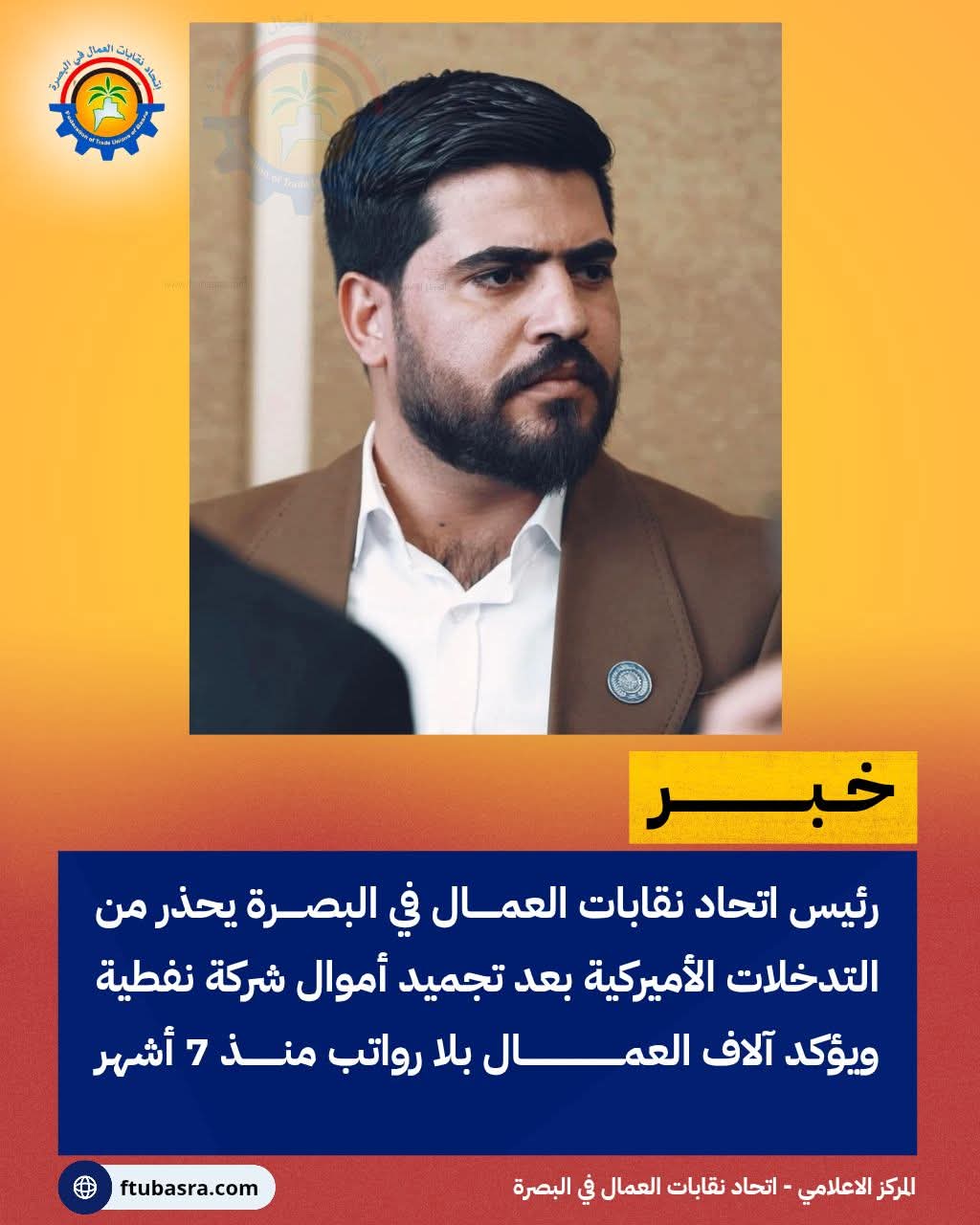 حذّر رئيس اتحاد نقابات العمال في البصرة، أحمد فهمي الخفاجي، من التدخلات الأميركية التي تسبّبت بحجز أموال إحدى الشركات النفطية العاملة في أحد الحقول النفطية بالمحافظة، مؤكداً أن هذا الإجراء «غير المسؤول» انعكس بشكل مباشر وسلبي على حياة آلاف العمال من أبناء البصرة. وقال الخفاجي في تصريح صحفي، إن حجز الأموال أدى إلى تأخر رواتب العاملين لأكثر من سبعة أشهر متواصلة، ما أدخل عوائلهم في دائرة ضيق معيشي خانق، في محافظة تُعدّ عاصمة العراق الاقتصادية، لكنها تواجه اليوم أزمة معيشية تضرب شريحة كبيرة من أبنائها العاملين في القطاع النفطي. وأوضح أن هذه التدخلات تعدّ «انتهاكاً صارخاً للسيادة الاقتصادية العراقية»، لافتاً إلى أن العمال هم المتضرر الأكبر من أي نزاع سياسي أو مالي خارجي، وأن تركهم دون رواتب لهذه المدة الطويلة «يمثل ظلماً فادحاً لا يمكن التغاضي عنه». وطالب الخفاجي الحكومة الاتحادية ووزارة النفط بـ التدخل العاجل لإيجاد حلّ سريع يضمن إطلاق الأموال وصرف جميع المتأخرات، إضافة إلى وضع آلية حماية تمنع تكرار مثل هذه الأزمات التي تهدد الأمن المعيشي للعمال وتربك عمل الشركات النفطية. وأكد في ختام تصريحه أن اتحاد نقابات العمال في البصرة لن يقف مكتوف الأيدي، وسيواصل متابعة الملف من خلال القنوات الرسمية والدستورية، داعياً جميع الجهات إلى تحمّل مسؤولياتها تجاه «شريحة عاملة تمثل العمود الفقري لاقتصاد العراق». المركز الاعلامي الاثنين، 17 تشرين الثاني 2025 |