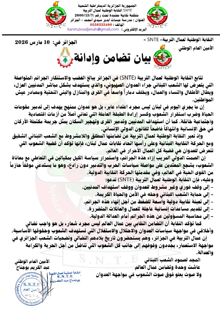 أصدرت النقابة الوطنية لعمال التربية في الجزائر (SNTE) بياناً أعربت فيه عن غضبها واستنكارها الشديدين للجرائم المتواصلة التي يتعرض لها الشعب اللبناني نتيجة العدوان الصهيوني، مؤكدة تضامنها الكامل مع لبنان وشعبه في مواجهة ما وصفته بالاعتداءات التي تستهدف المدنيين والبنية التحتية. وجاء في البيان أن الاعتداءات التي يشهدها لبنان لا تمثل “حادثة عابرة”، بل تشكل عدواناً ممنهجاً يطال المدنيين، من أطفال ونساء وعمال، ويؤدي إلى تدمير القرى والمنازل والبنى التحتية ومصادر عيش المواطنين. كما اعتبرت النقابة أن استهداف المدنيين وتهجير السكان يمثل انتهاكاً صارخاً للقانون الدولي الإنساني وجريمة بحق الإنسانية. وأكدت النقابة تضامنها المطلق واللامشروط مع الشعب اللبناني ومع الحركة النقابية اللبنانية، وعلى رأسها اتحاد نقابات عمال لبنان، مشددة على أن قضايا الشعوب التي تتعرض للعدوان هي قضية جميع العمال الأحرار في العالم. وانتقد البيان ما وصفه بـ"الصمت الدولي المريب" إزاء ما يجري، معتبراً أن سياسة الكيل بمكيالين في التعاطي مع معاناة الشعوب تشجع المعتدين على الاستمرار في سياسات الحرب والتدمير دون رادع، داعياً القوى الحية في العالم، وخاصة الحركة النقابية الدولية، إلى اتخاذ مواقف حازمة. ودعت النقابة الوطنية لعمال التربية إلى: وقف فوري وغير مشروط للعدوان ووقف استهداف المدنيين. حماية الشعب اللبناني وضمان حقه في الأمن والحياة الكريمة. تعبئة نقابية دولية واسعة للضغط من أجل إنهاء هذه الاعتداءات. تقديم مساعدات إنسانية عاجلة للعمال والعائلات المتضررة. محاسبة المسؤولين عن هذه الجرائم أمام العدالة الدولية. كما شددت النقابة على أن التضامن النقابي بين عمال العالم ليس مجرد شعار، بل واجب نضالي وأخلاقي في مواجهة سياسات العدوان والاحتلال والاستغلال التي تستهدف الشعوب وحقوقها الأساسية. وختمت النقابة بيانها بالتأكيد على أن عمال التربية في الجزائر، وهم يستحضرون تاريخ بلادهم النضالي وتضحيات الشعب الجزائري في مواجهة الاستعمار، يجددون وقوفهم إلى جانب كل الشعوب التي تناضل من أجل الحرية والكرامة والعدالة. البيان صدر في الجزائر بتاريخ 10 مارس 2026، ووقعه الأمين العام الوطني للنقابة عبد الكريم بوجناح.