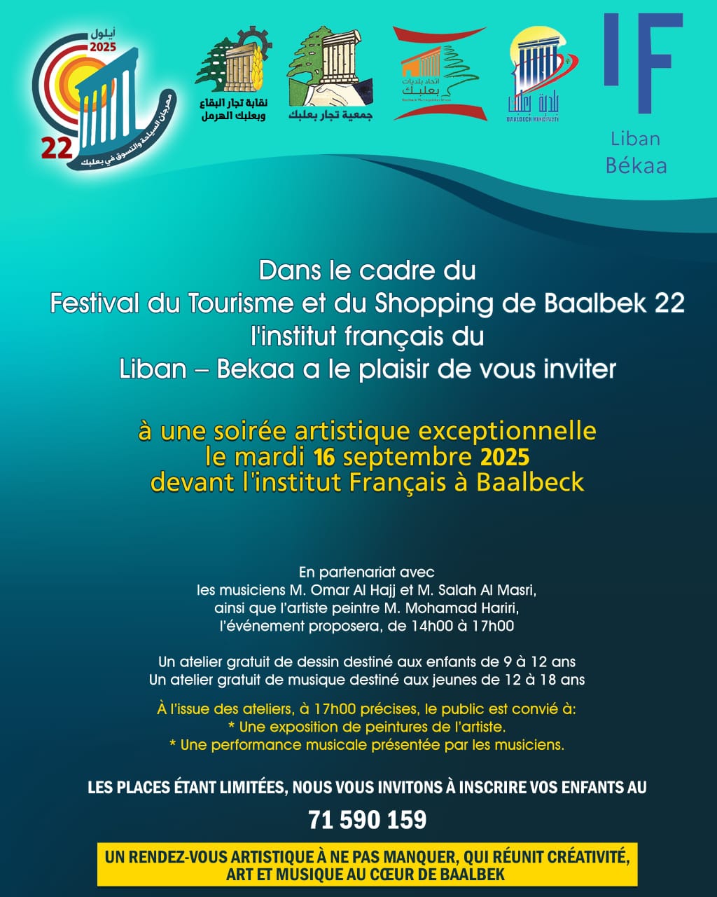 ضمن فعاليات مهرجان السياحة و التسوق في بعلبك 22 ، يسر المركز الثقافي الفرنسي في لبنان - البقاع ، أن يدعوكم إلى أمسية فنية مميّزة يوم الثلاثاء 16 أيلول 2025 ، أمام المركز الفرنسي في بعلبك، وبالشراكة مع العازفين الأستاذ عمر الحاج ، والأستاذ صلاح المصري ، والفنان التشكيلي الأستاذ محمد حريري . وسيقام من الساعة 2:00 بعد الظهر حتى 5:00 مساءً ورشة رسم مجانية للأطفال من عمر 9 إلى 12 سنة ، وورشة موسيقية مجانية للشباب من عمر 12 إلى 18 سنة ، وعند انتهاء الورش، و في تمام الساعة الخامسة ، سيكون الجمهور على موعد مع معرض لوحات للفنان التشكيلي، وفقرة فنية موسيقية للعازفين. وكون الأماكن محدودة ، ندعوكم لتسجيل أولادكم عبر الرقم : 71590159 موعد فني لا يفوّت يجمع بين الابداع الفن والموسيقى في قلب بعلبك |